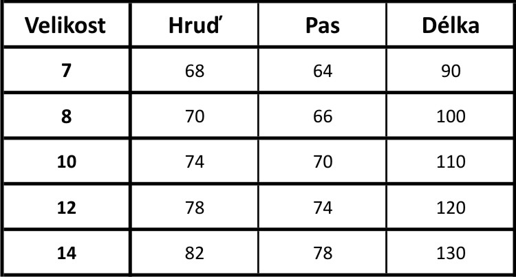 Při výběru velikosti změřte dívce hrudník, připočtěte cca 4-8 cm rezervu a podle toho vyberte z tabulky velikostí.