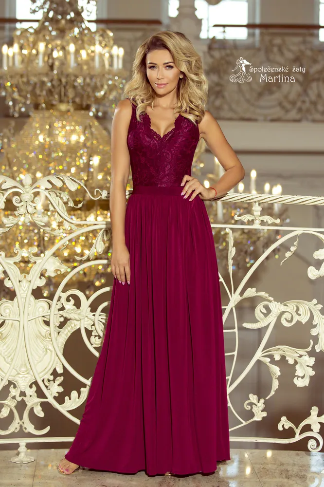 Dlouhé společenské šaty "Lea" s krajkovým živůtkem - vínové vel. L