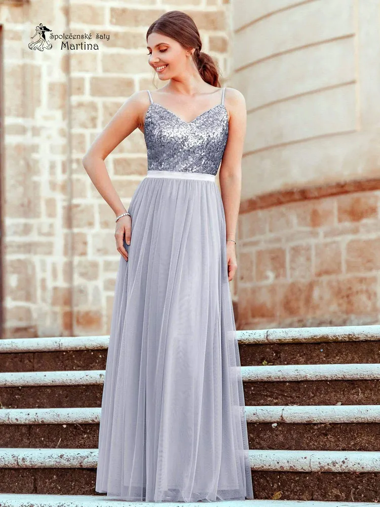 - Dlouhé stříbrné společenské šaty "Milly" se špagetovými ramínky - vel. 42