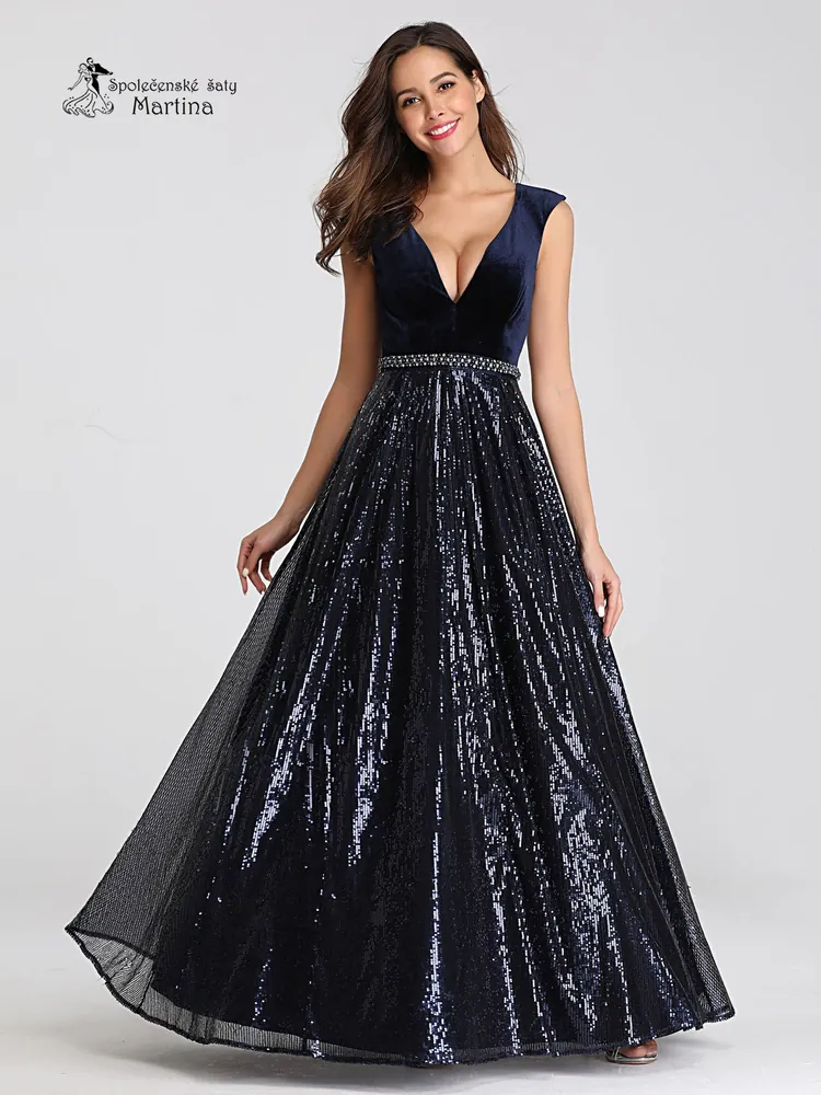 Dlouhé tmavě modré společenské šaty se sametovým živůtkem "Linett" - vel. 341 690 Kč/ ks1 397 Kč bez DPH