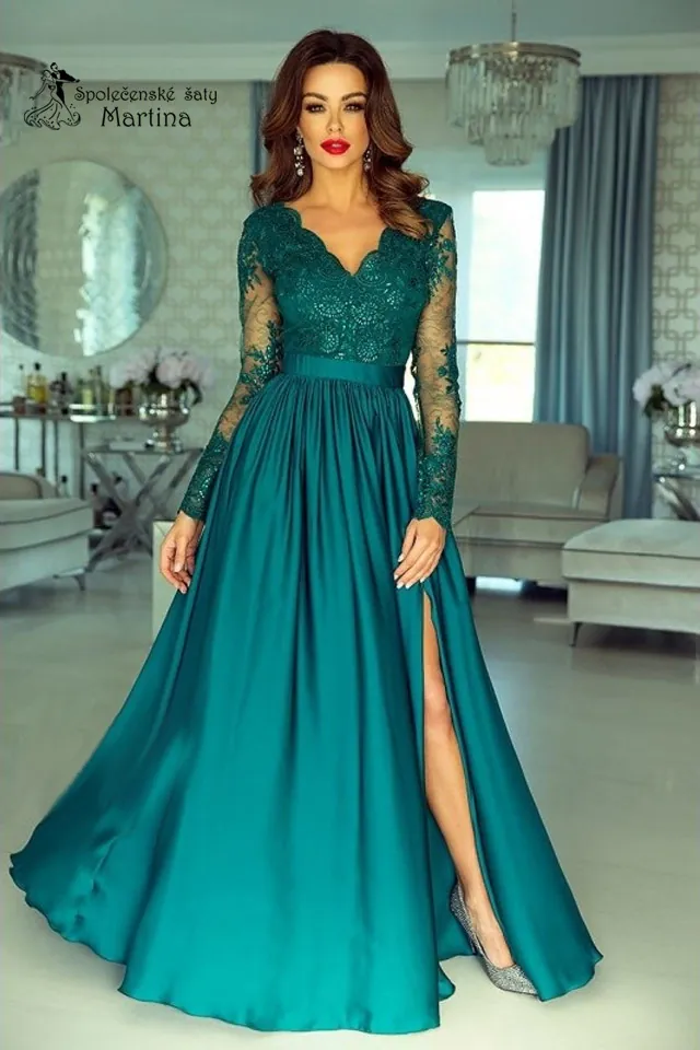 Dlouhé společenské šaty s krajkovými rukávy