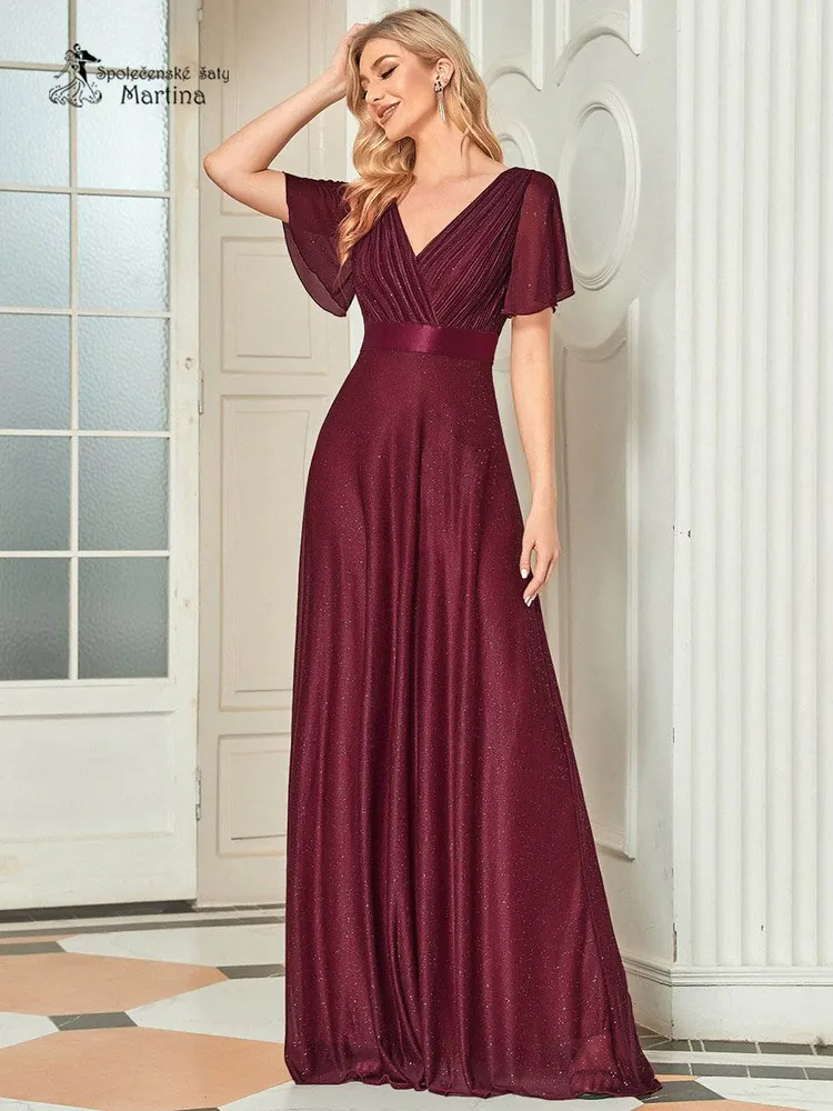 Vínové jemně třpytivé společenské šaty s volnými rukávy "Darien"