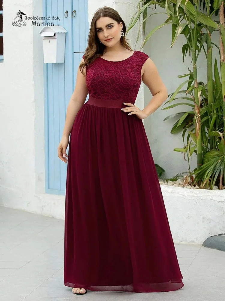 Vínové společenské šaty "Siera XXL" s krajkovým živůtkem