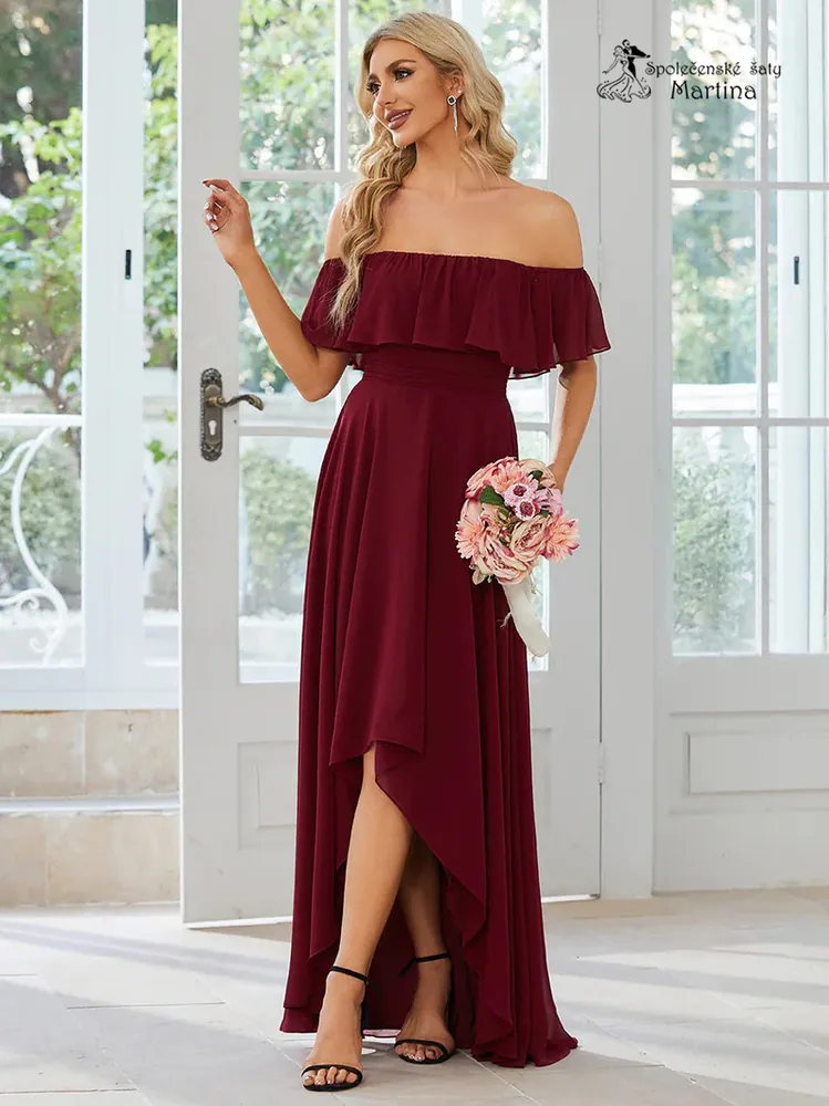 Asymetrické vínové šaty pro svatebního hosta "Aimee" se spadenými volánkovými rameny - vel. 40
