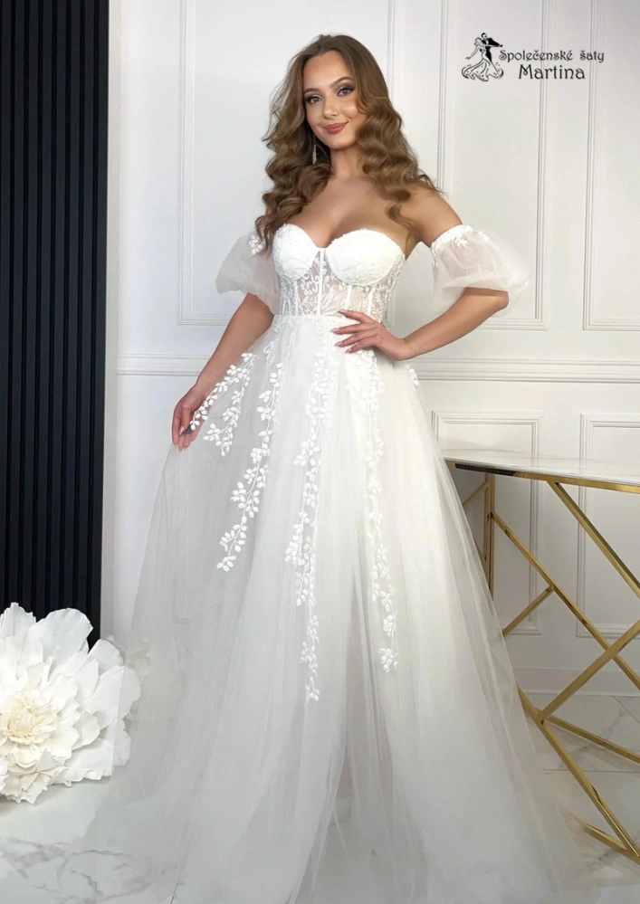 - Bílé tylové svatební šaty "Orchidea" s korzetovým živůtkem a krajkovou aplikací