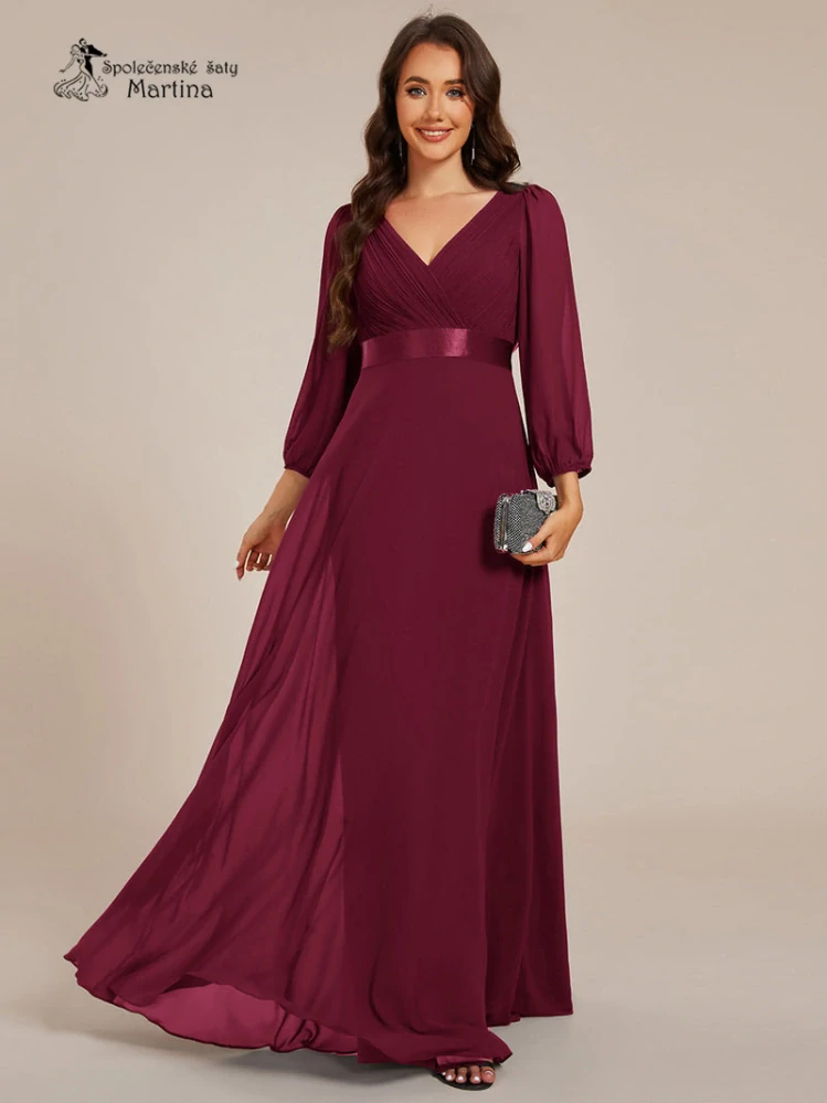 - Dlouhé vínové šifonové společenské šaty “Camelia” s 3/4 rukávem