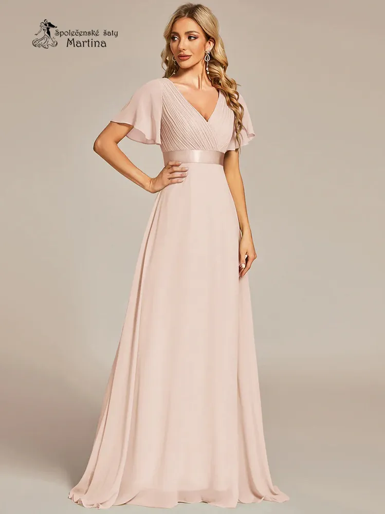 » krásné šifonové společenské šaty antického střihu s lehkými rukávy a hustě skládaným výstřihem