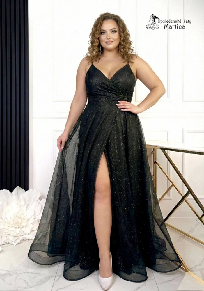 Černé třpytivé maturitní šaty "Venus" s obálkovým živůtkem a rozparkem - vel. XXXL
