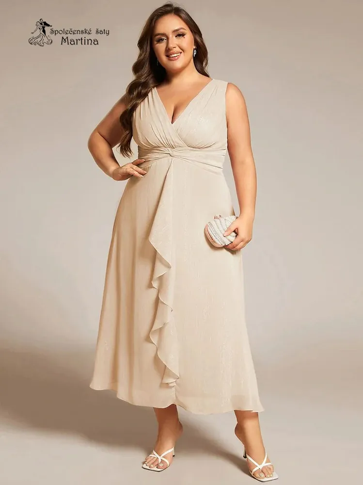 - Elegantní champagne šaty s lesklými detaily a jemným volánem "Nelly"