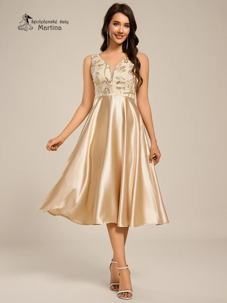 - Champagne midi společenské šaty "Basmath" s pevnou saténovou sukní a zdobeným živůtkem