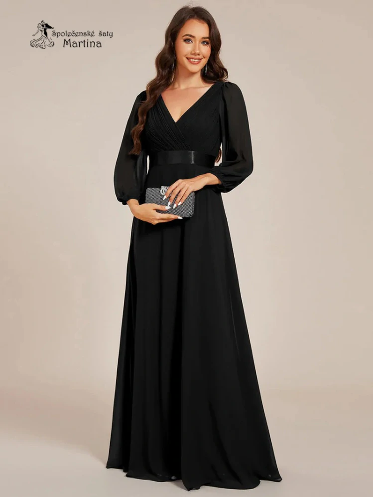 - Dlouhé černé šifonové společenské šaty “Camelia” s 3/4 rukávem