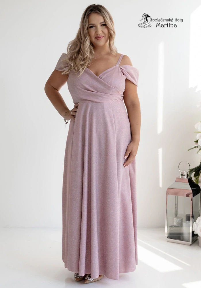 3. Dlouhé pudrově růžové brokátové společenské šaty "Valentina" se spadenými rukávy
