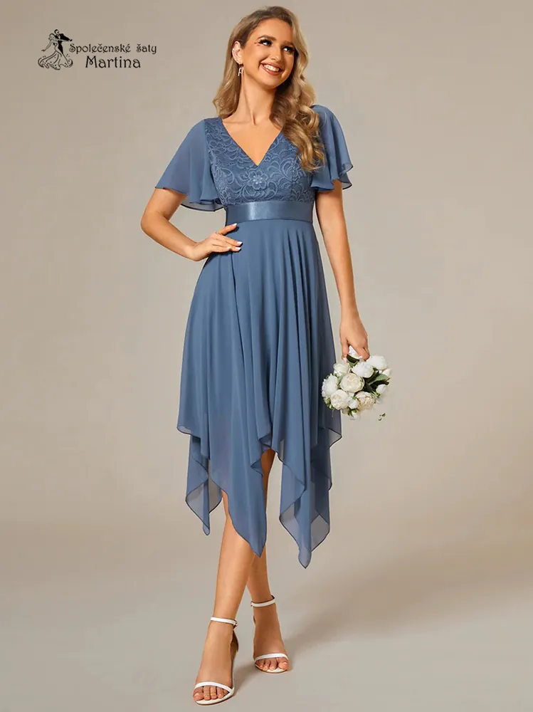 - Dusty navy krátké šaty s cípy v sukni a volným rukávem "Jackeline"
