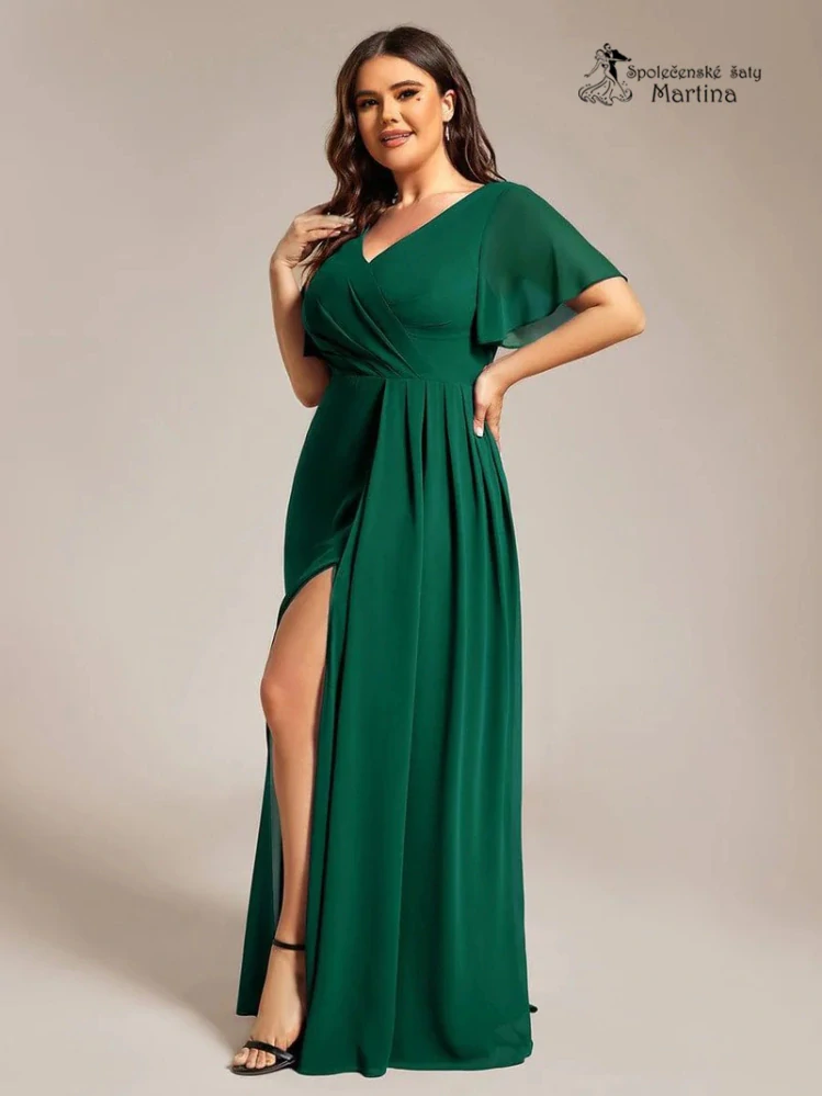 - Elegantní tmavě zelené společenské šaty s volnějším krátkým rukávem "Janine" - vel. 48