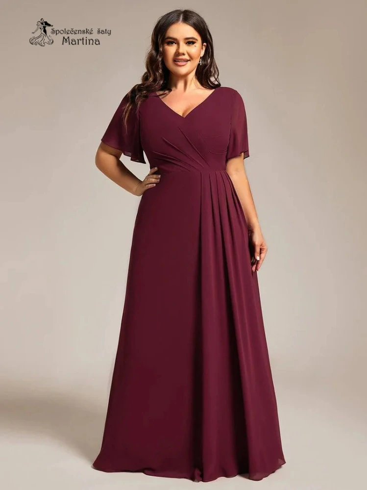 Elegantní vínové společenské šaty s volnějším krátkým rukávem "Janine"