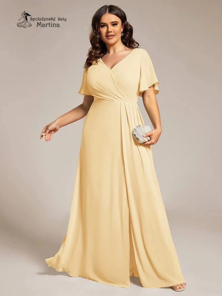 - Elegantní žluté společenské šaty s volnějším krátkým rukávem "Janine"
