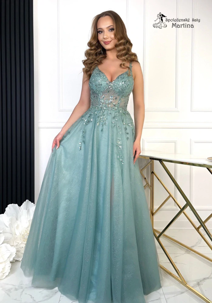 - Eukalyptové plesové šaty "Ferrero" s vyšívaným korzetem a jemným třpytem - vel. L