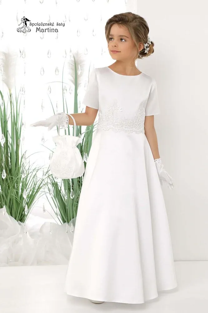 » vysoce kvalitní a noblesní dlouhé šaty ze sněhově bílého svatebního saténu určené zejména pro družičky či k prvnímu svatému přijímání