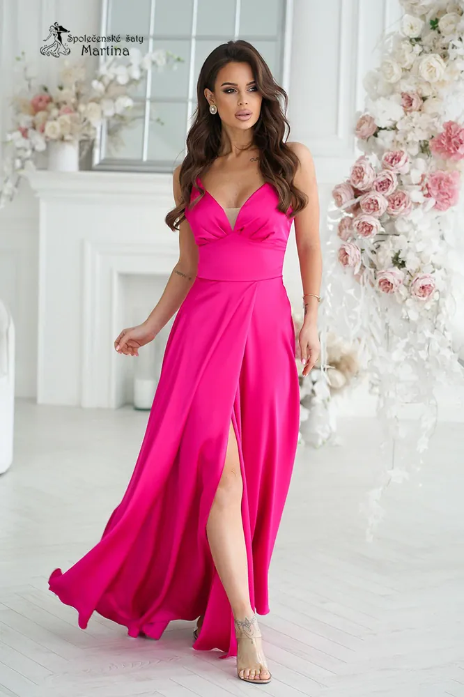 - Fuchsiové saténové dlouhé šaty "Ally" na tenká ramínka a s rozparkem - vel. 38