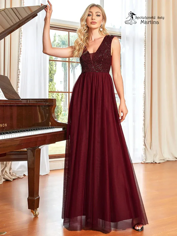 - Vínové tylové šaty "Kaety" s flitrovým živůtkem a širokými ramínky