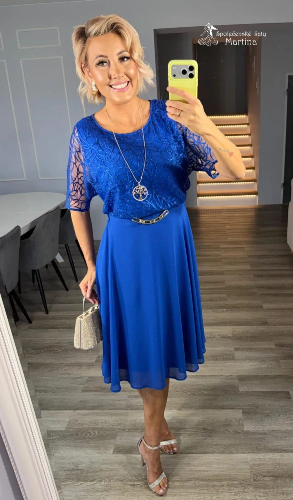 - Královsky modré společenské šaty "Bindy" s vzorovaným živůtkem a áčkovou sukní - vel. 46