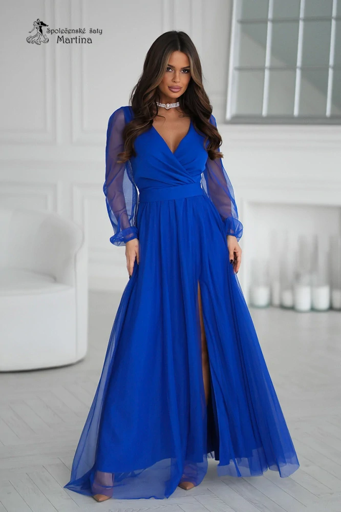 Královsky modré tylové společenské šaty "Alisha" s poloprůhlednými rukávy