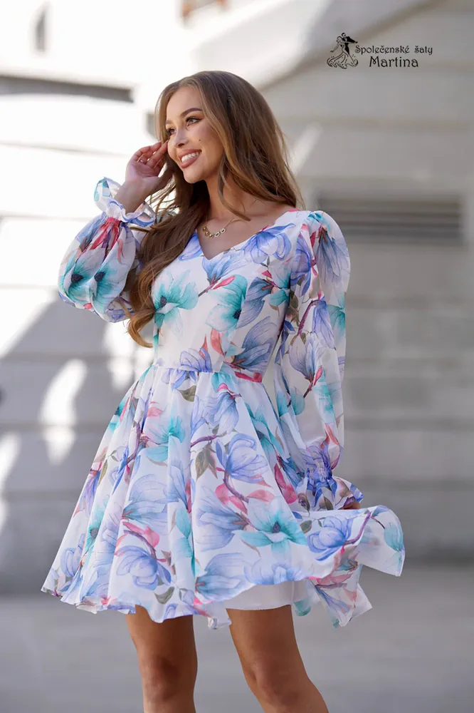 - Krátké květované šaty "Lena" s dlouhými rukávy - modré květy