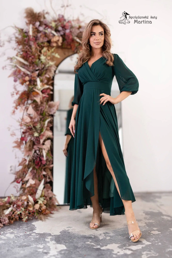 - Lahvově zelené dlouhé asymetrické šifonové šaty "Abigail" s ¾ rukávem - vel. 50
