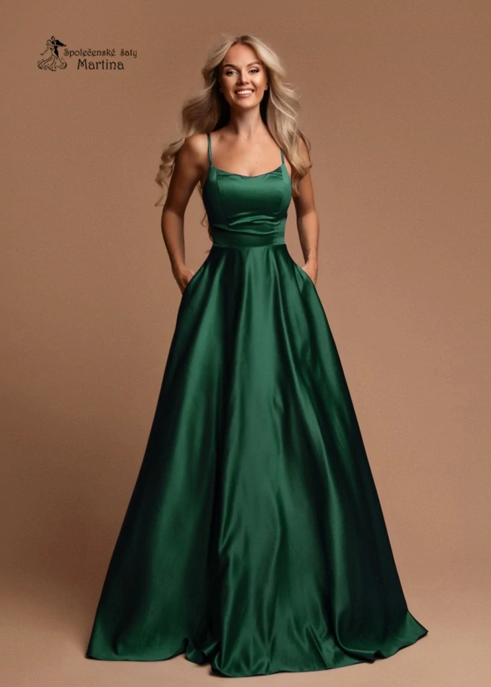 - Lahvově zelené saténové maturitní šaty "Helen" s kapsami - vel. L
