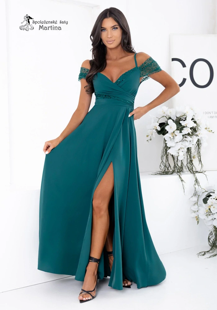 3. Lehké lahvově zelené společenské šaty "Jeri" s flitrovým zdobením a rozparkem