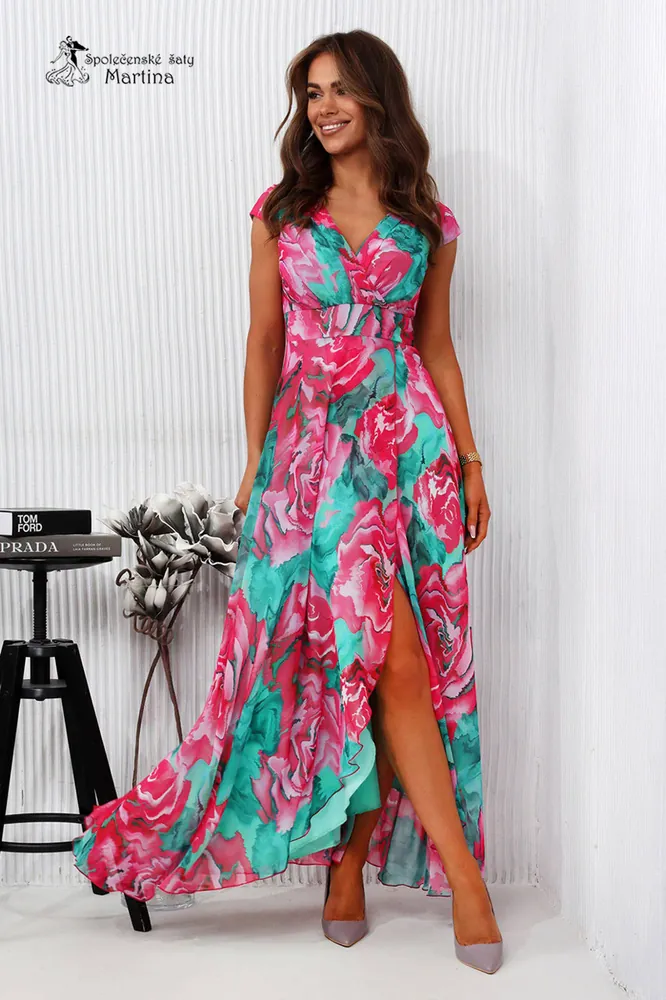 Lehké letní dlouhé šaty s potiskem "Emma" - zeleno-fuchsiové - vel. 36