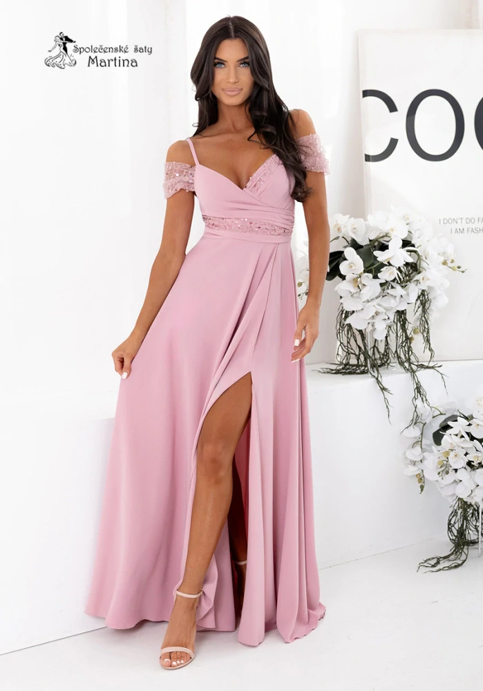 - Lehké pudrově růžové společenské šaty "Jeri" s flitrovým zdobením a rozparkem