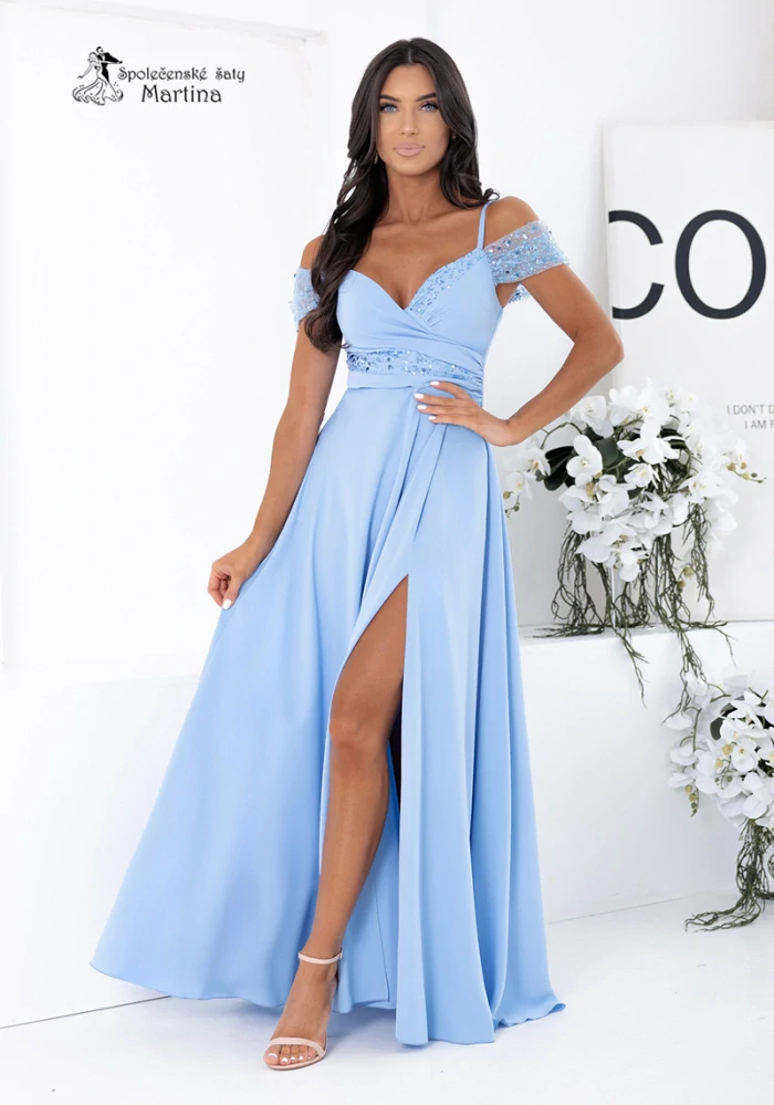 Lehké světle modré společenské šaty "Jeri" s flitrovým zdobením a rozparkem2 490 Kč/ ks2 058 Kč bez DPH