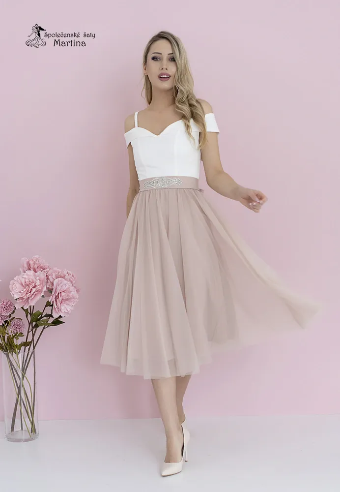 Midi bílo-cappucinové šaty pro svatebního hosta či družičku "Daisy" se spadenými ramínky
