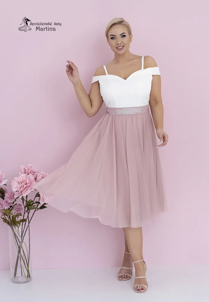 Midi bílo-starorůžové šaty pro svatebního hosta či družičku "Daisy" se spadenými ramínky