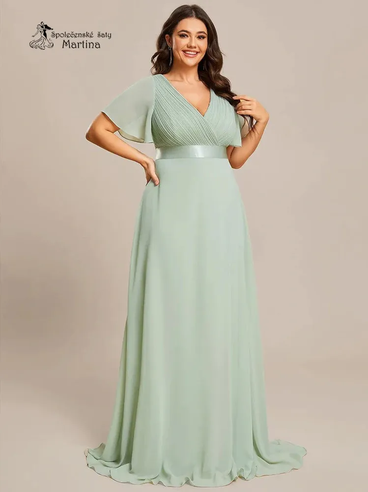 » krásné šifonové společenské šaty antického střihu s lehkými rukávy a hustě skládaným výstřihem