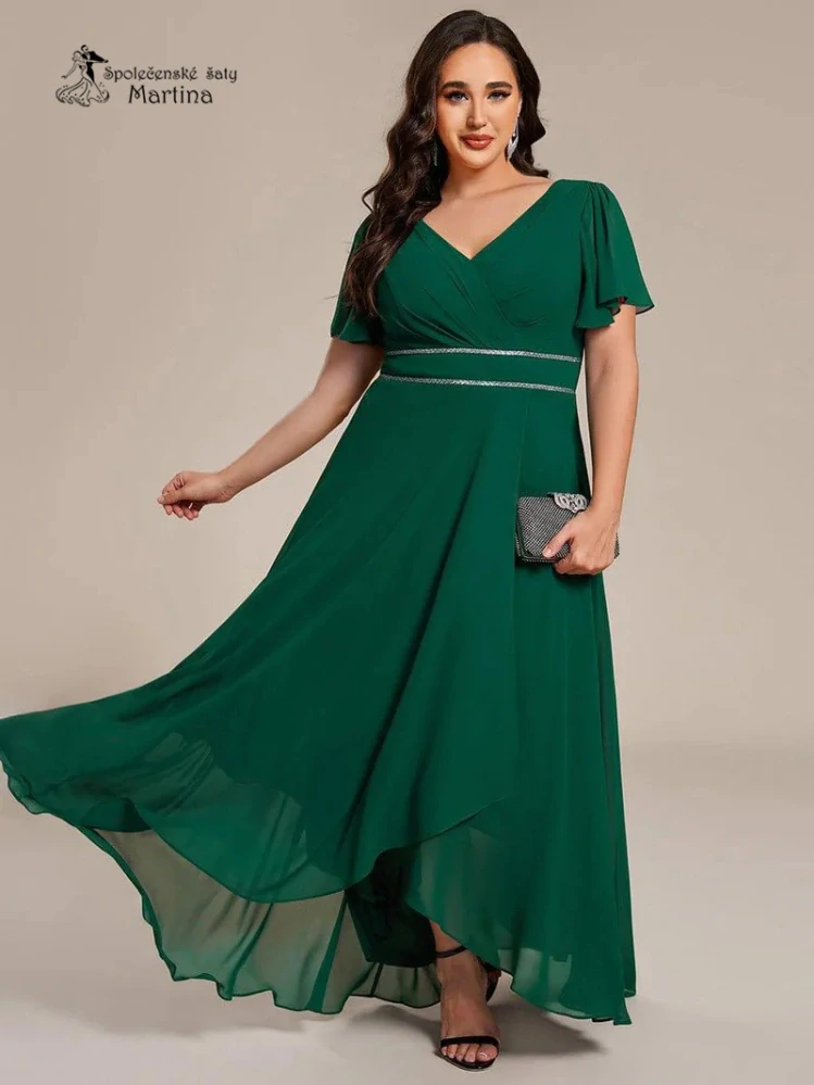 3. Mírně asymetrické tmavě zelené šaty s motýlími rukávy a ozdobným páskem "Ellie"