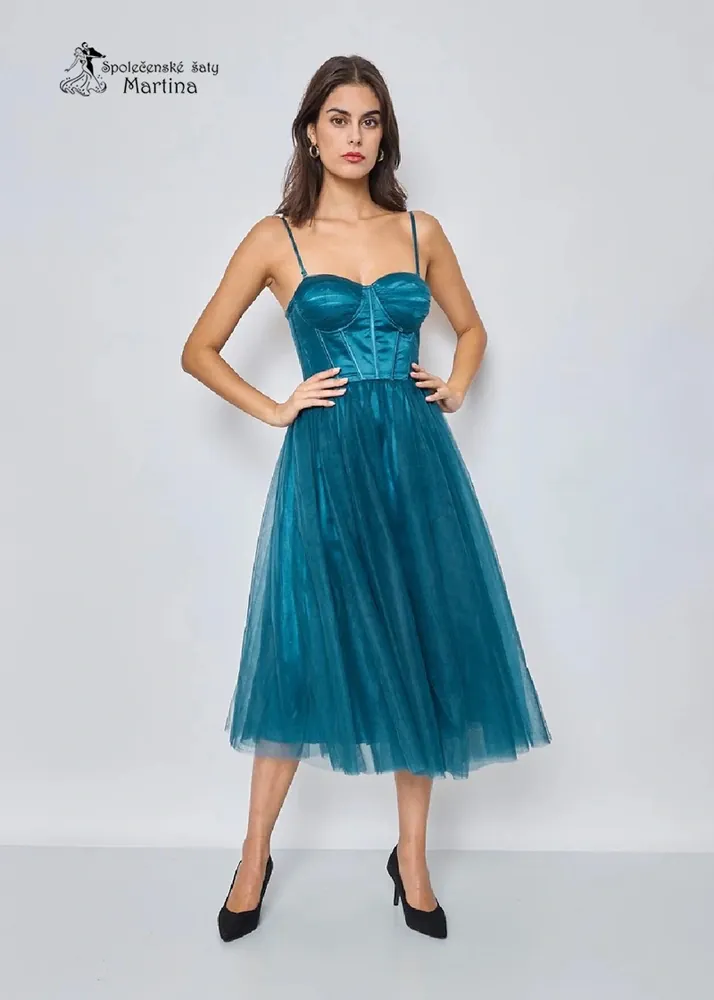 - Petrolejové midi tylové šaty "Ella" se šněrováním na zádech - vel. M