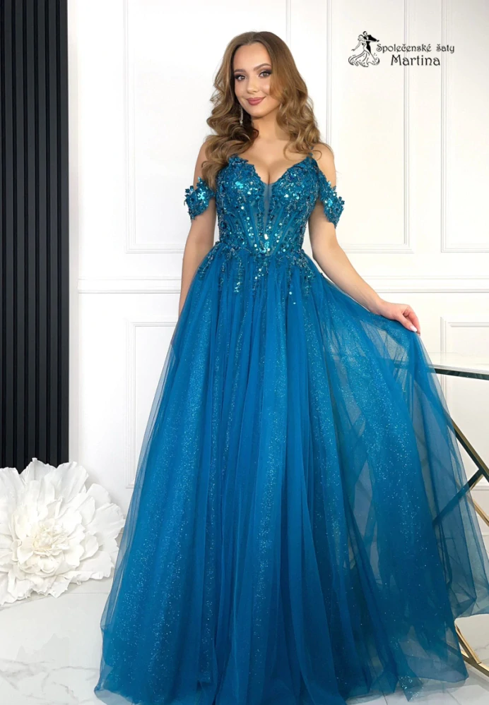 Petrolejové třpytivé společenské šaty "Inéza" se spadenými ramínky - vel. Mcena od 3 690 Kč/ kscena od 3 050 Kč bez DPH