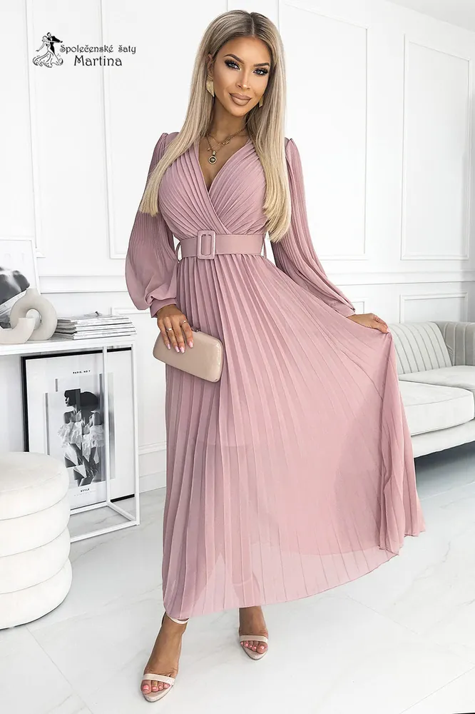 Pudrově růžové dlouhé plisované šaty pro svatebního hosta "Moyra" s dlouhým rukávem - vel. UNI1 790 Kč/ ks1 479 Kč bez DPH