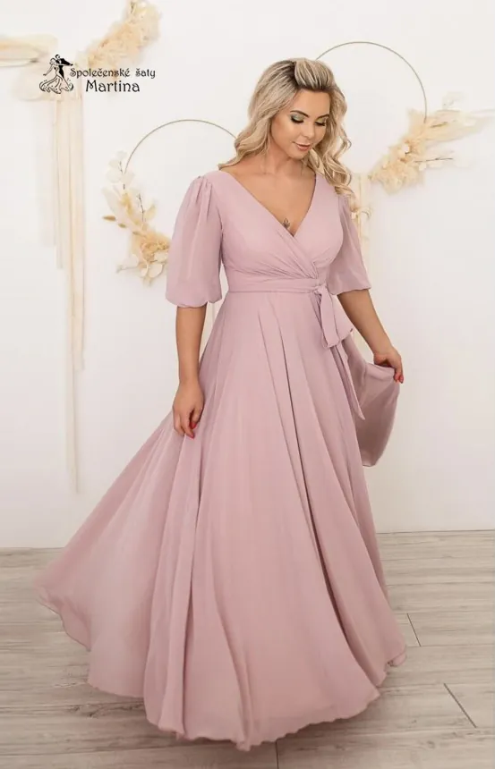 - Pudrově růžové dlouhé společenské šaty "Vera" s 1/2 rukávem