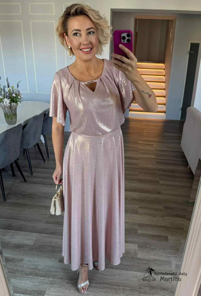 - Pudrově růžové společenské šaty "Primavera" s třpytivým efektem a širokou sukní - vel. 48