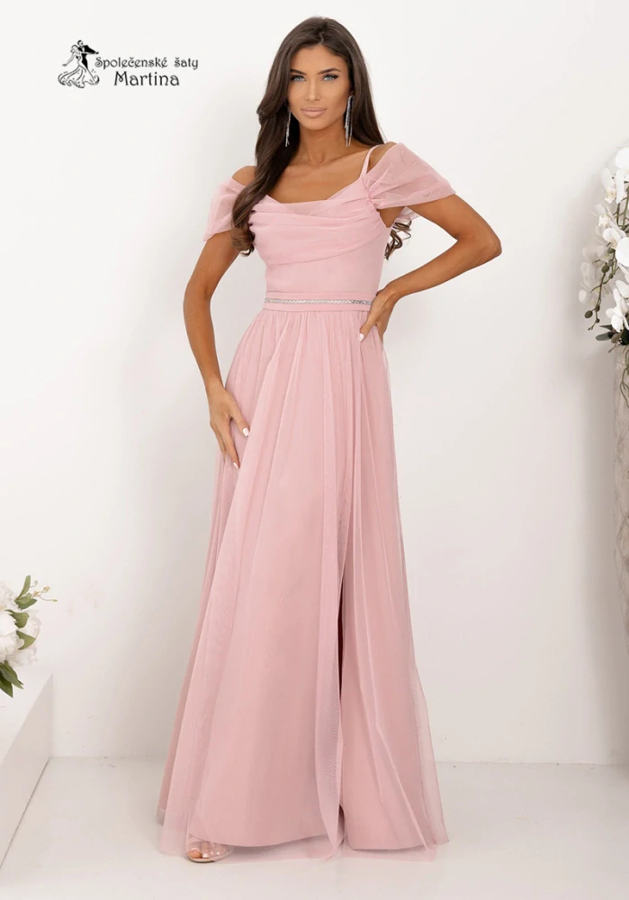 Pudrově růžové tylové společenské šaty "Kiara" s rozparkem a spadenými rameny