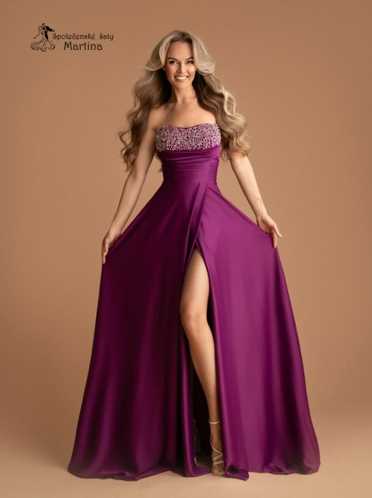 Purpurové saténové společenské šaty "Lina" se zdobeným živůtkem a na šněrování - vel. S2 690 Kč/ ks2 223 Kč bez DPH