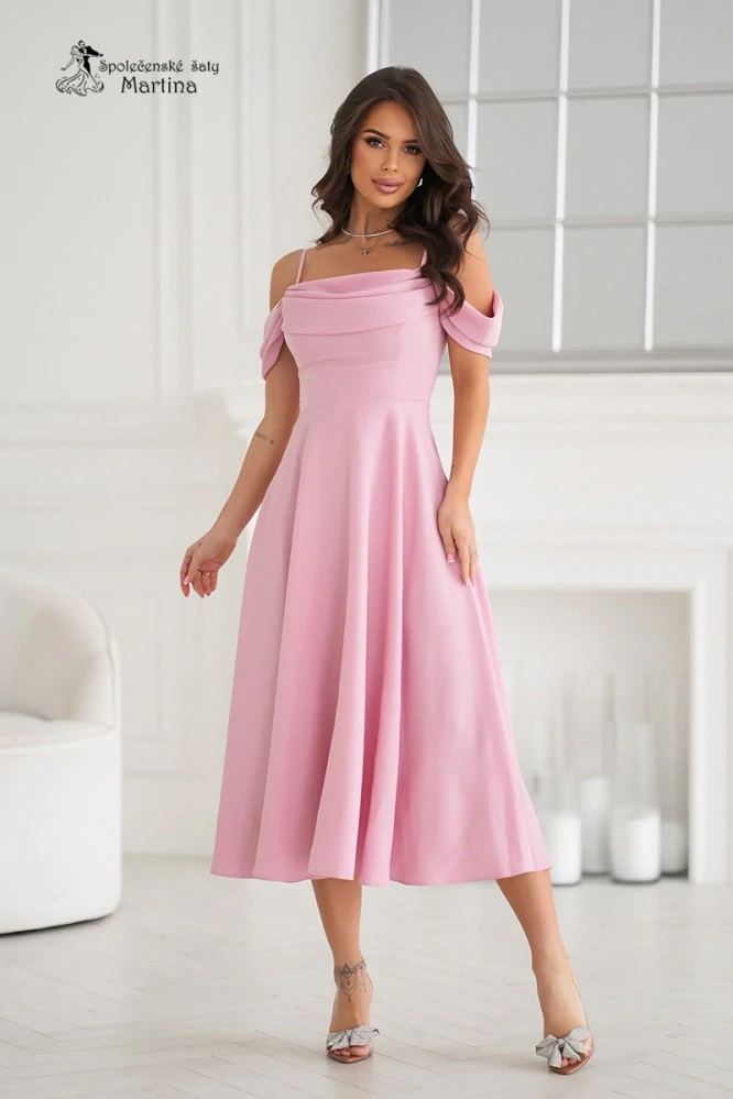 - Růžové hladké midi šaty "Sunshine" se spadenými ramínky - vel. 34