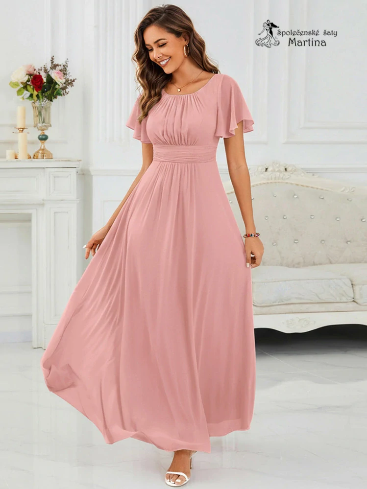 - Růžové šifonové šaty s rukávkem a žabičkováním na zádech "Stela"