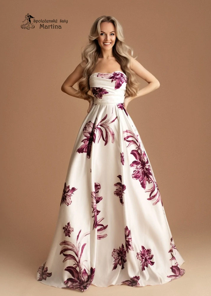 3. Saténové společenské šaty "Rebeca" s bordó květinovým vzorem a šněrováním na zádech