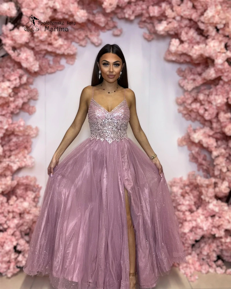 » třpytivé šaty na ramínka mají smyslný střih s decentním rozparkem