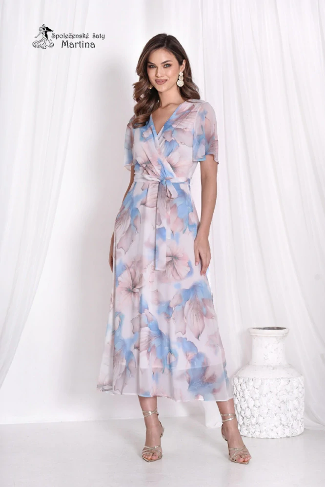 Světle modré lehké květované šaty "Perle" s překládaným výstřihem a páskem - vel. 422 390 Kč/ ks1 975 Kč bez DPH