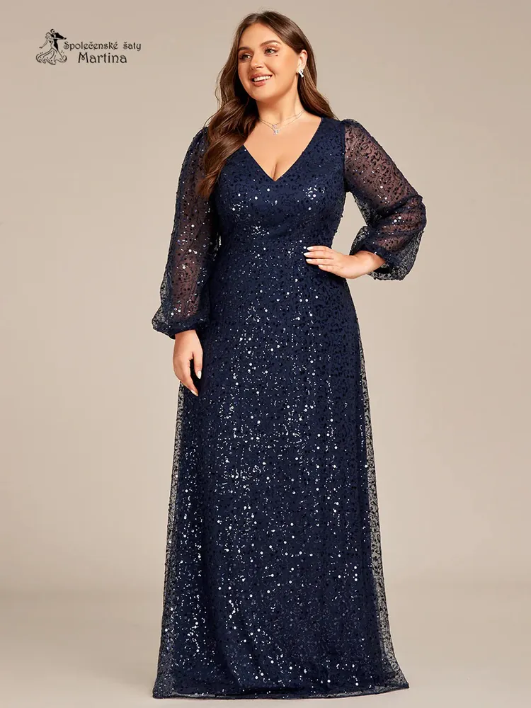 3. Tmavě modré celozdobené společenské XXL šaty s dlouhými rukávy "Careen"